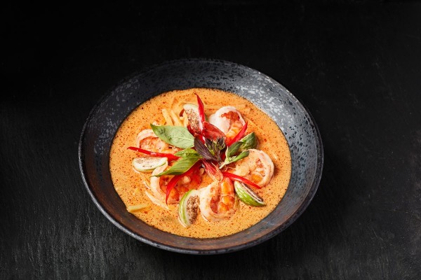 59. Kaeng pet goong (Tigerrejer i rød karry) Tigerrejer tilberedt i rød karry, kokosmælk, bambusskud, sød basilikum og thai auberginer Husk at ris skal bestilles separat. Pris kr. 119,00 Læg i kurven