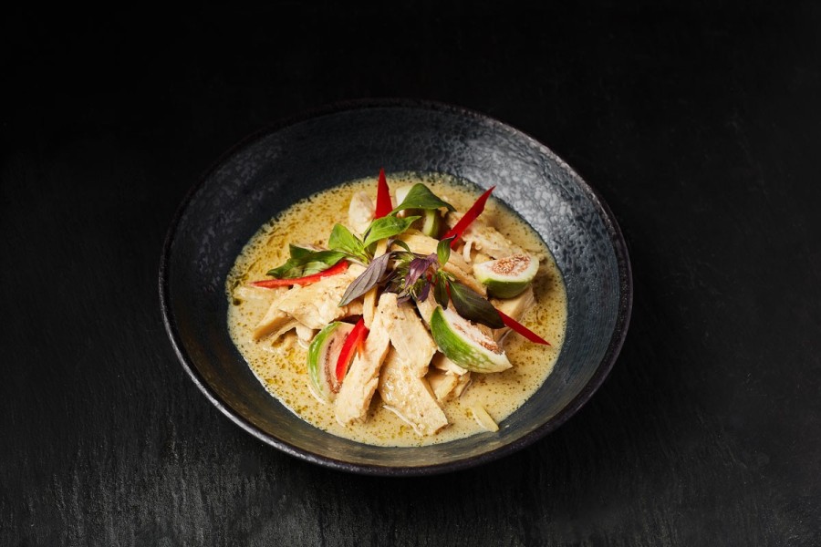 Kylling stegt i grøn karry, kokosmælk, basilikum, bambusskud og små thailandske auberginer.
