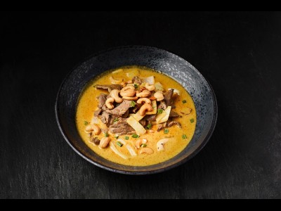 Beef in yellow curry, coconut milk, onion, spring onion and cashew nuts.