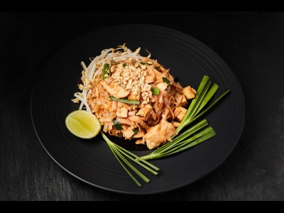 Fried noodles with chicken, beansprouts,tofu, sweet soya and peanuts